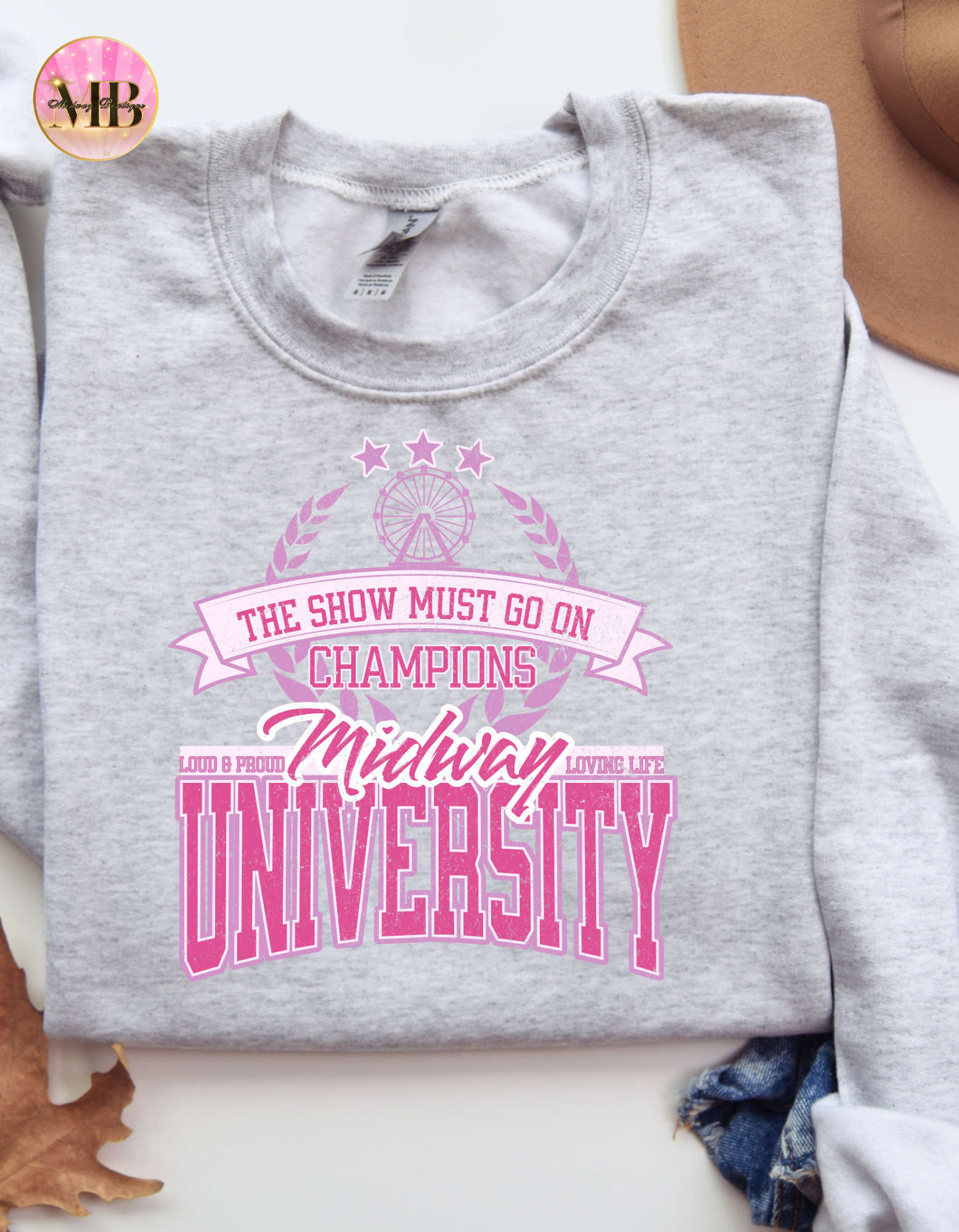 Step right up and show your spirit in this crisp white crewneck sweatshirt featuring "Midway University" pride. This is the ultimate nod to carnival vibes and carefree fun.