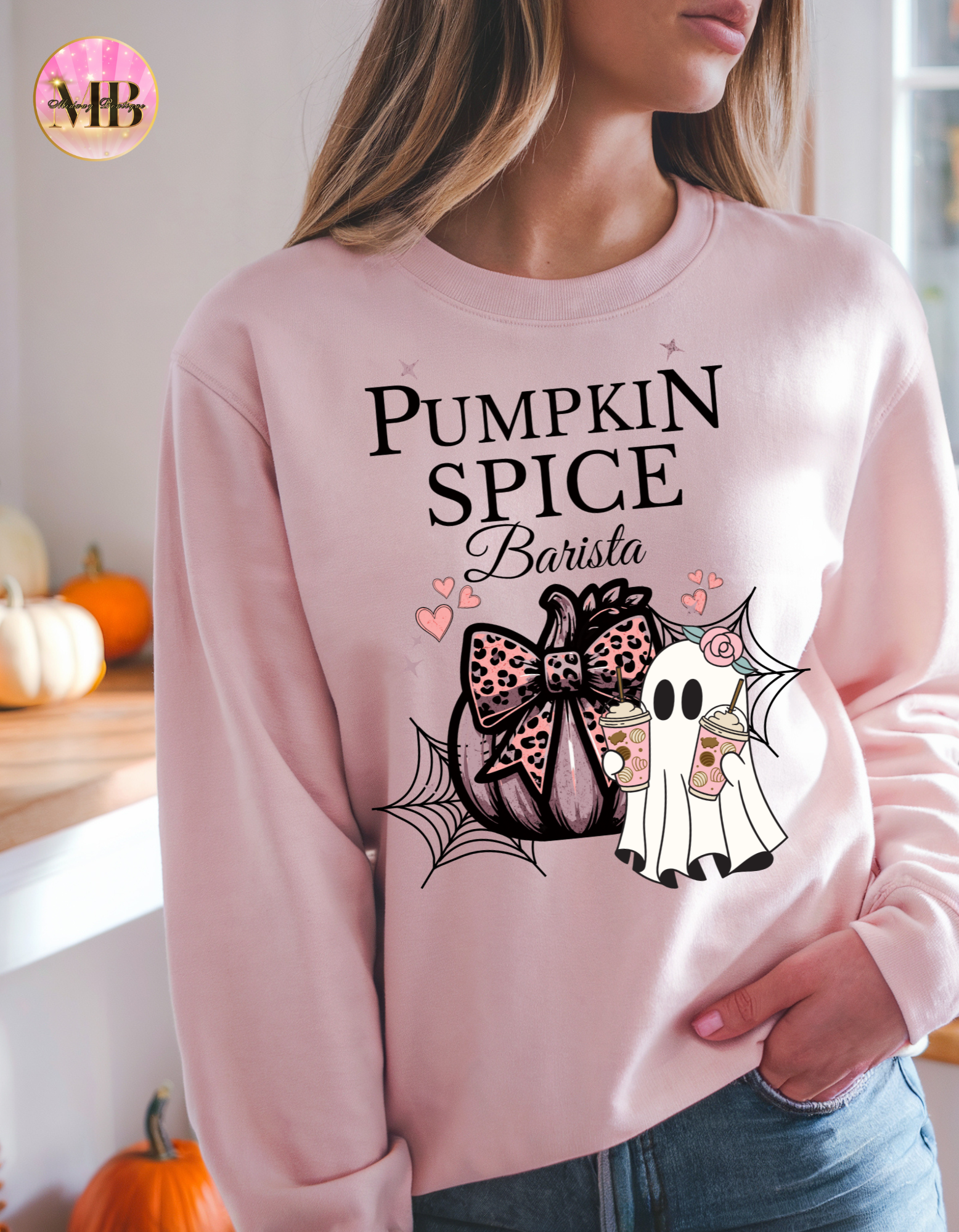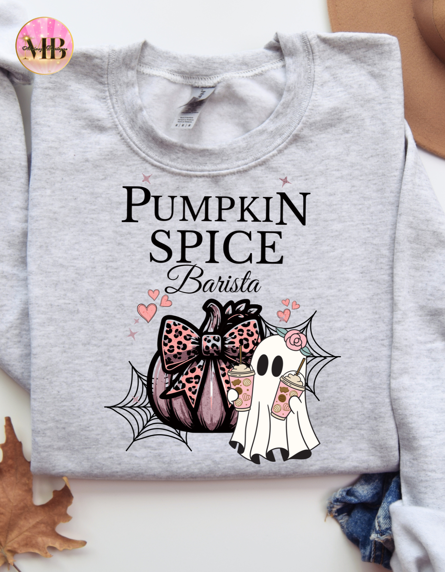 Serve up spooky season vibes in style with this cozy woman's crewneck sweatshirt featuring our unique "Pumpkin Spice Barista" design, front and center!